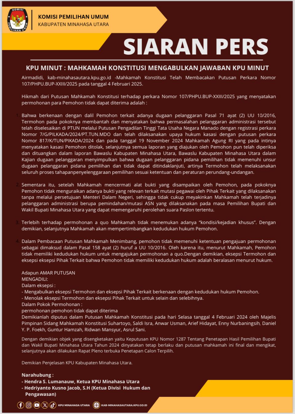 • Mahkamah Konstitusi Mengabulkan Jawaban KPU Minut
