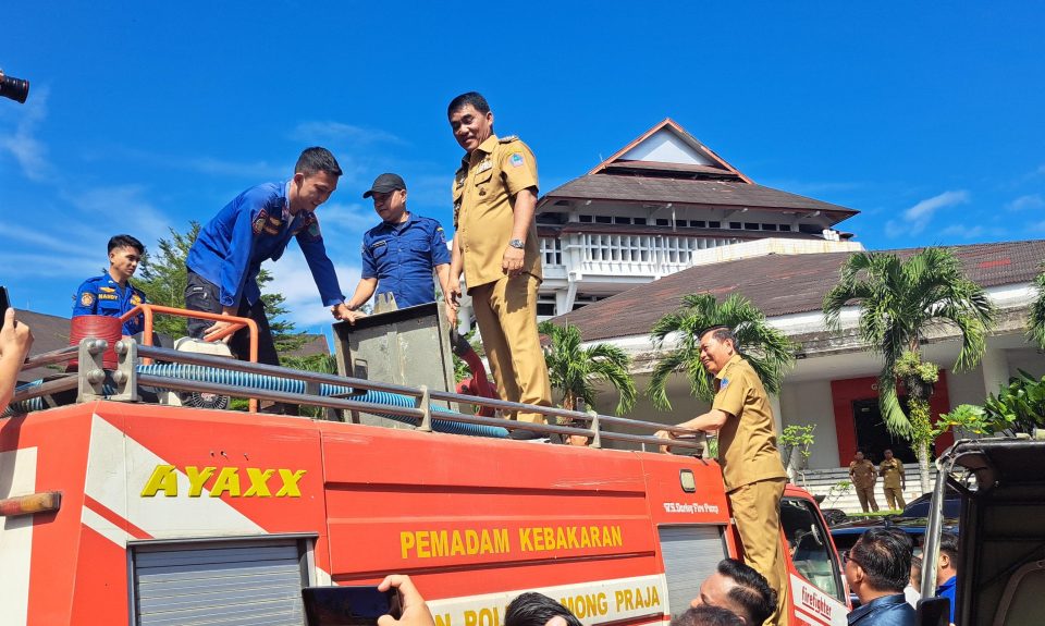 Saat melihat kondisi mobil pemadam kebakaran, Gubernur Yulius ikut melihat langsung dari atas kendaraan tersebut.