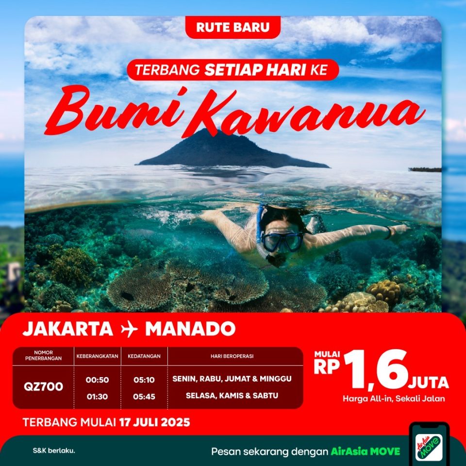 BASISBERITA.COM, Manado – Maskapai berbiaya hemat terbaik dunia versi Skytrax selama 15 tahun berturut-turut, Indonesia AirAsia membuka rute terbaru yang menghubungkan Jakarta dan Manado. Penerbangan akan beroperasi setiap hari mulai 17 Juli 2025, dengan tiket yang sudah dapat dipesan mulai hari ini. Kehadiran rute ini merupakan bagian dari komitmen
