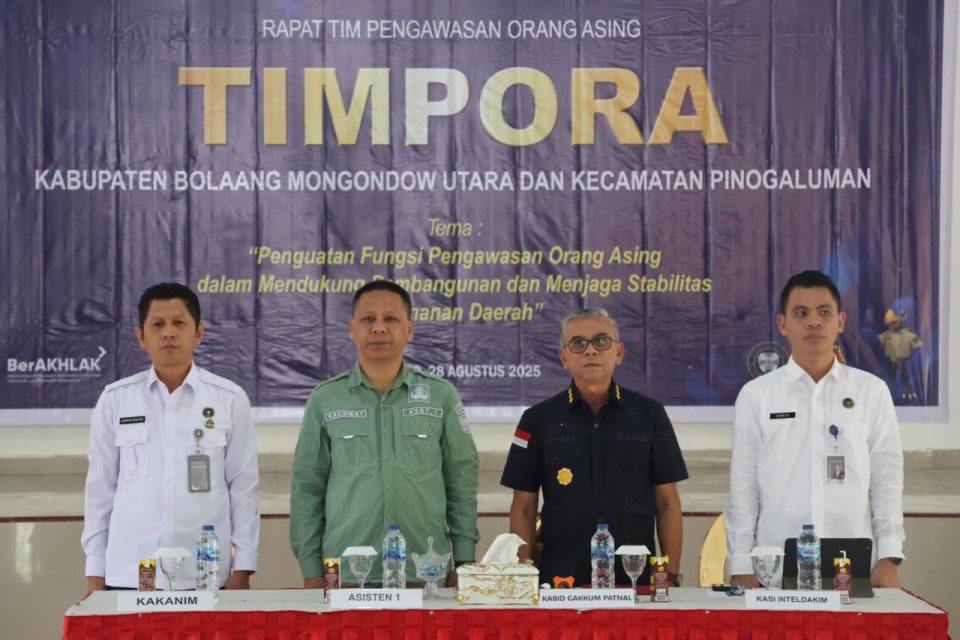 BASISBERITA.COM, Bolmut – Kantor Imigrasi Kelas II Non TPI Kotamobagu terus memperkuat sinergi antarinstansi dalam pengawasan orang asing melalui Rapat Koordinasi TIMPORA Kabupaten Bolaang Mongondow Utara (Bolmut) dan TIMPORA Kecamatan Pinogaluman, yang digelar di Hotel Boroko, Kamis (28/8/2025). Rapat ini mengangkat tema “Penguatan Fungsi Pengawasan Orang Asing dalam Mendukung Pembangunan dan Menjaga Stabilitas Keamanan Daerah”.