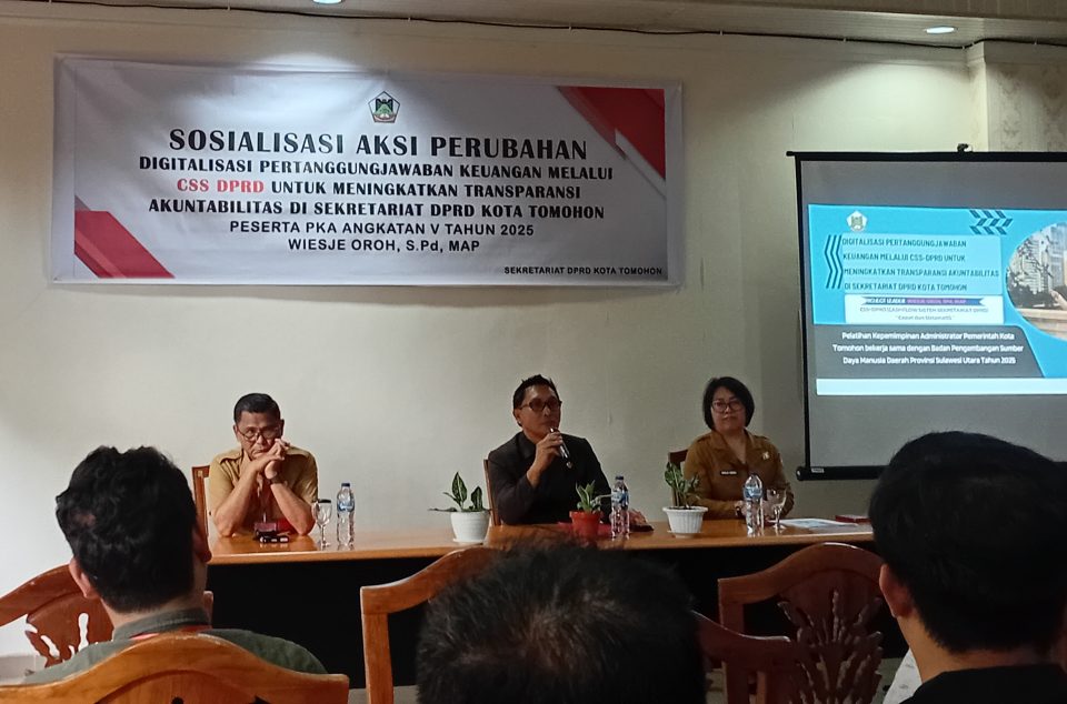 BASISBERITA.COM, Tomohon— Sekretariat DPRD Kota Tomohon terus melakukan pembenahan dalam pengelolaan keuangan daerah dengan menggelar kegiatan Sosialisasi Aksi Perubahan Digitalisasi Pertanggungjawaban Keuangan melalui CSS-DPRD, Selasa (14/10), bertempat di Kantor DPRD Kota Tomohon.