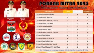 BASISBERITA.COM, MITRA- Hasil perolehan sementara medali Pekan Olahraga Kabupaten (PORKAB) Ke II Mitra, kecamatan Silian Raya, berada dipuncak klasemen disusul kecamatan Tombatu ditempat kedua.